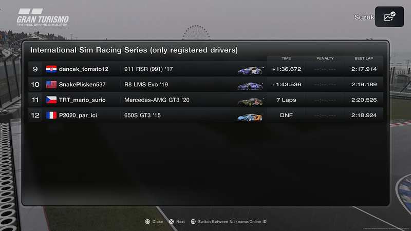 | P | Driver | Votes | Vehicle | Laps | Best Lap Laps | Time/Gap | PP | Pts | ||