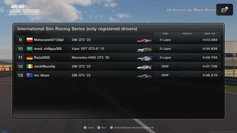 | P | Driver | Votes | Vehicle | Laps | Best Lap Laps | Time/Gap | PP | Pts | ||